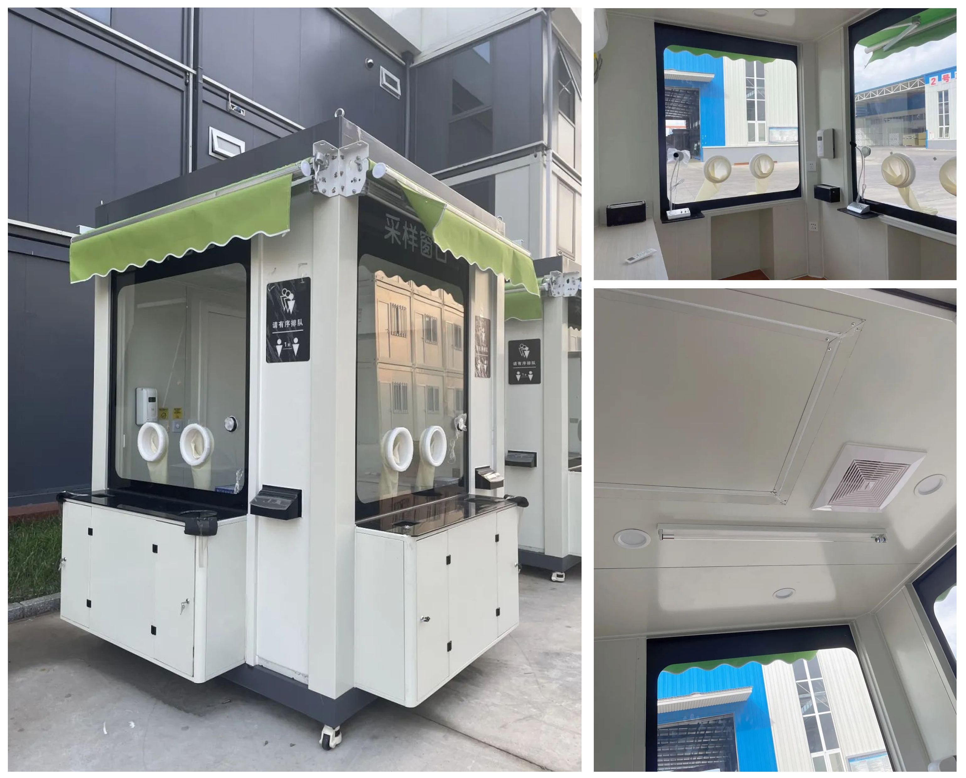 JHHY HOUSE nucleic acid sampling booth adopts a modular container house technology system. The top of the main structure is equipped with a positive pressure system, fresh air system, UV sterilization system, and air conditioning system. By creating an indoor pressure difference, the system effectively reduces the risk of virus infection for personnel inside the booth.